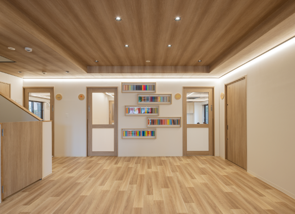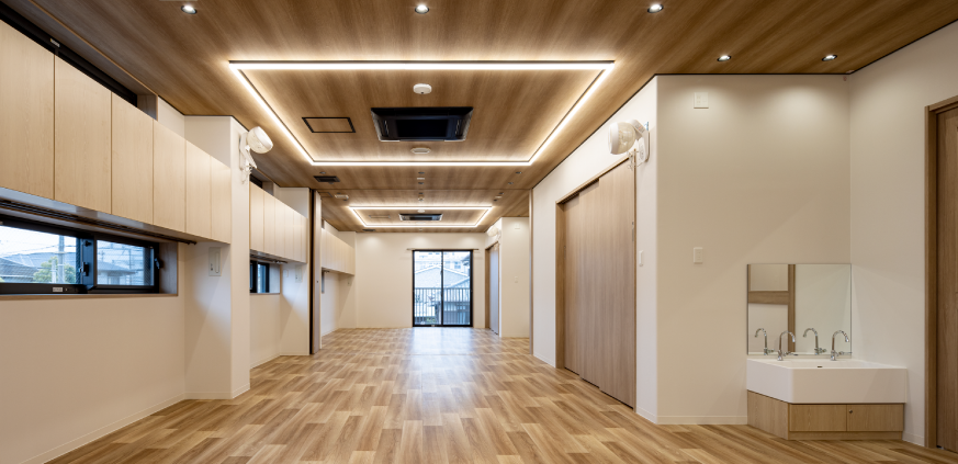 兵庫県伊丹市の阪急伊丹駅から徒歩5分程度の場所で、静かな住宅地に位置する認可保育所のプロジェクトです。園庭はアプローチ沿いに計画し、2階バルコニーからも園庭に下りれる外階段を設けて自由に遊びまわれるように考えました。また2階の保育室は天井高が高く確保できたので横長の窓を高い位置と低い位置に設け保育室内が直射日光が当たらないようにしました。